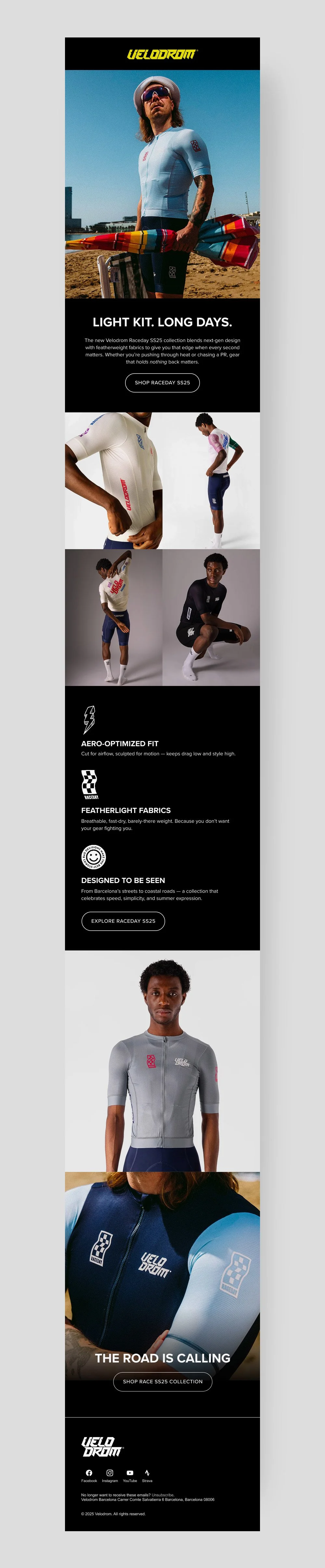 This email design concept focuses on one of Velodrom’s summer cycling kit collections. Instead of packing multiple announcements, the idea was to tell one clear visual story.